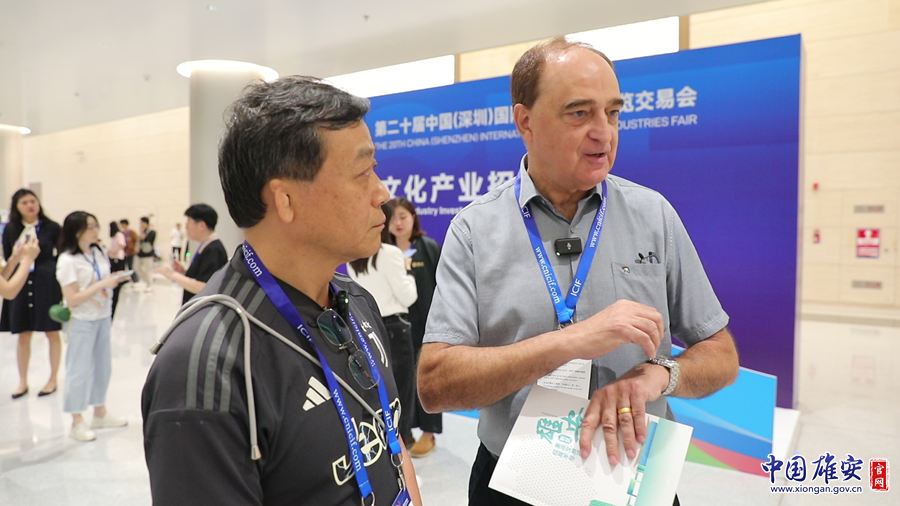 5月24日,深圳文博会上,比利时Alterface公司执行董事倚天(右一)有意投资雄安文化产业项目。刘潇 摄