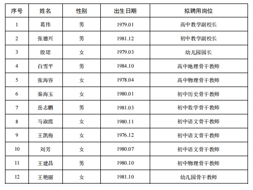 根据雄安新区2024年度面向全国公开选聘校(园)长、骨干教师工作安排,经网上报名、资格审查及简历筛选、面试、资格复审、体检、综合考察等程序,确定以下人员为拟聘用人员,现予以公示。