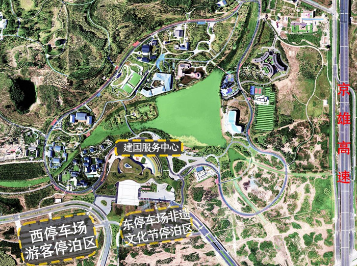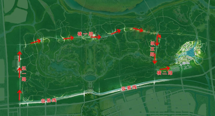 路线三:高德、百度地图导航雄安郊野公园北门,走京雄高速辅路(注意不要上高速)—横一路(雄安郊野公园北街)—纵五路—北部园路—一级园路—郊野公园,车辆停放在园区外部步行入园。