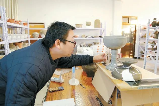 联合考古队员张胜正在手绘南阳遗址出土的陶豆。雷建红 摄