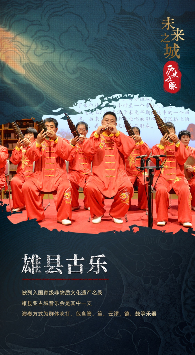 “未来之城”雄安,生长在深厚文化积淀之上,赓续数千年文明薪火。当地实施考古前置,对全域1770平方公里进行拉网式文物调查和勘察。目前已开展专题考古10项、基本建设考古23项,出土文物4000余件,确认不可移动文物263处,其中包括8座古城遗址;在大规模建设的同时,注重传承弘扬优秀传统文化,让新城市有老场所,群众能“记得住乡愁”,按照古树不挪、古建筑不拆、古牌坊不搬的原则,已登记保护物质类乡愁保护点2600多项;有形的文物古迹、古树古宅被保护起来了,无形的非物质文化遗产也得到传承弘扬。如今,白洋淀传统造船技艺、雄县古乐、鹰爪翻子拳等非遗项目在这里得到保护传承。