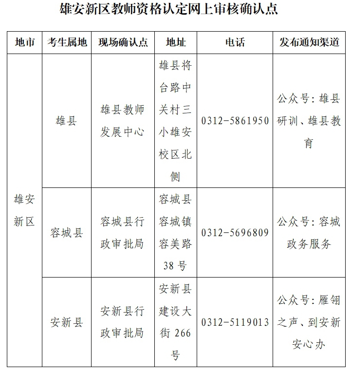 三、教师资格认定条件、流程和相关注意事项,请查阅我局于3月14日,在中国雄安官网上发布的“雄安新区2024年上半年中小学和幼儿园教师资格认定公告”(//www.xiongan.gov.cn/2024-03/14/c_1212341504.htm)。