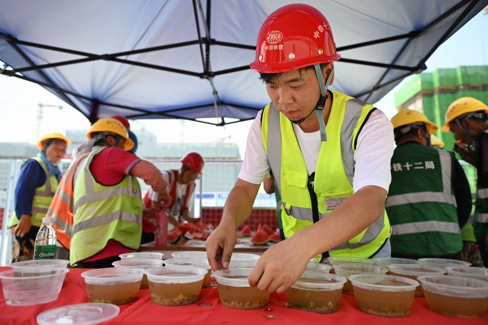 6月13日,在雄安新区大河片区安置房及配套设施项目建设现场,中铁十二局工作人员在整理准备发放给工人的绿豆汤。新华社记者牟宇 摄
