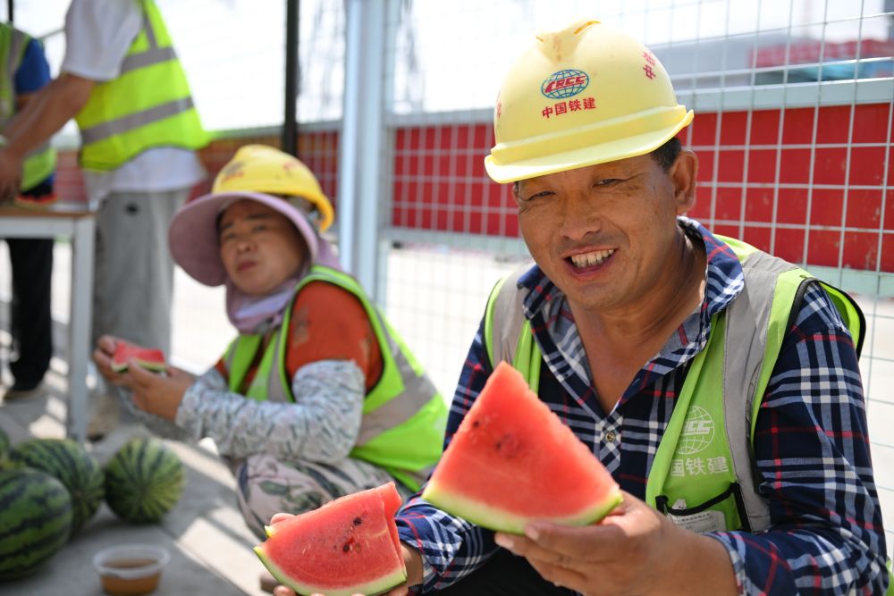 6月13日,在雄安新区启动区,中国建筑股份有限公司工人在雄忻高铁雄安地下段及相关配套工程四标段项目一处“工友驿站”内吃西瓜解暑。新华社记者牟宇 摄