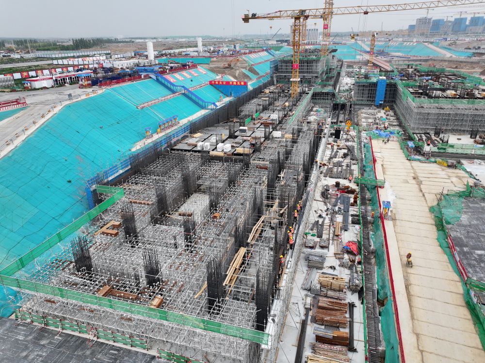 6月13日,在雄安新区启动区,中国建筑股份有限公司工人在雄忻高铁雄安地下段及相关配套工程四标段建设现场作业(无人机照片)。新华社记者牟宇 摄