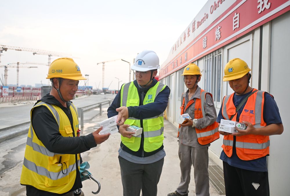 6月13日,在位于雄安新区启动区的雄忻高铁雄安地下段及相关配套工程四标段项目工地,中国建筑股份有限公司工作人员在给工人发放防暑物品。新华社记者牟宇 摄