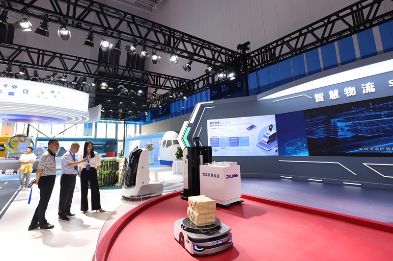 6月16日,在建设全国现代商贸物流重要基地场景汇,客商参观智慧物流搬运设备。