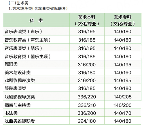 按照教育部规定,组织校考的高校艺术类专业,考生高考文化课成绩不低于普通类专业批次录取控制分数线。具体高考文化课成绩、破格录取等要求,按高校规定执行。专业录取控制分数线由院校自行确定并要求相应类别专业统考合格。