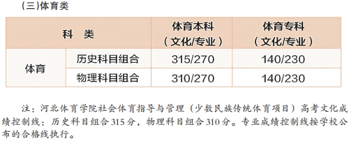 注:河北体育学院社会体育指导与管理(少数民族传统体育项目)高考文化成绩控制线:历史科目组合315分,物理科目组合310分。专业成绩控制线按学校公布的合格线执行。