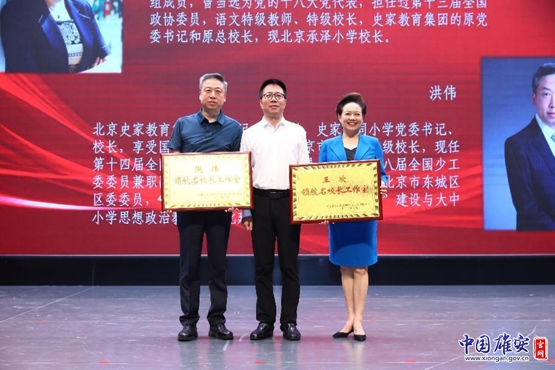 雄安新区公共服务局相关负责同志为王欢、洪伟领航名校长工作室颁牌。中国雄安官网发