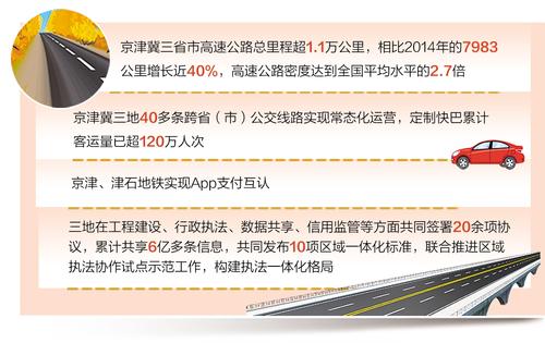 目前,京津冀三地40多条跨省(市)公交线路实现常态化运营,定制快巴累计客运量已超120万人次。京津、津石地铁实现App支付互认。三地在工程建设、行政执法、数据共享、信用监管等方面共同签署20余项协议,累计共享6亿多条信息,共同发布10项区域一体化标准,联合推进区域执法协作试点示范工作,构建执法一体化格局。