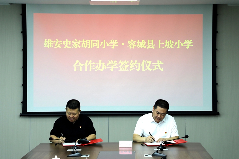 为深入落实京津冀协同发展要求,努力办好家门口人民满意的教育,6月26日上午,容城县上坡小学与雄安史家胡同小学举行“手拉手”合作协议签约仪式,史家教育集团党委书记、总校长洪伟,雄安新区党工委委员、容城县委书记黄志民,雄安新区公共服务局局长高立春出席会议并讲话。
