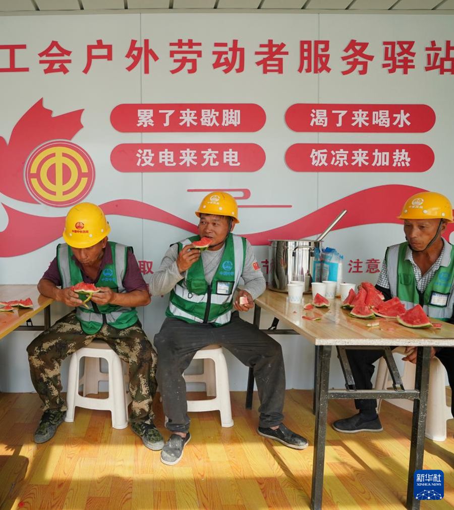 6月26日,中铁四局工人在一处劳动者服务驿站吃西瓜解暑。