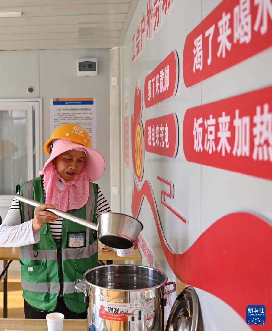 6月26日,中铁四局工人在一处劳动者服务驿站盛绿豆汤。