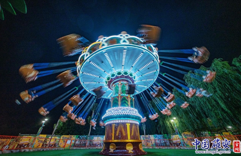 游客在雄安辛玛森林动物乐园夜场内体验游乐项目。中国雄安官网高盟 摄