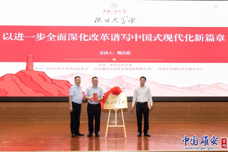 随后,杨新宇同雄安国士医学研究院董事长范其刚、中国工商银行河北省分行副行长谢刚一起为“陕公大学堂”牌匾揭牌,并向两位赠送图书《战火中的大学》。杨新宇向陶文昭颁发“中国人民大学‘陕公大学堂’演讲人”证书。