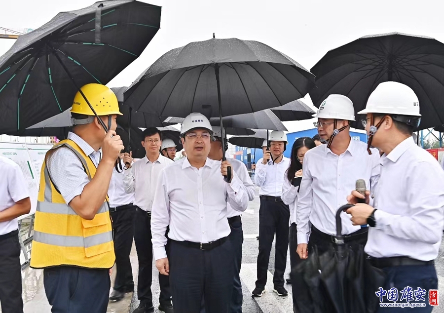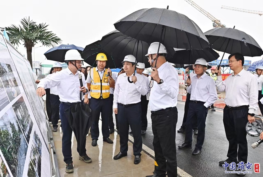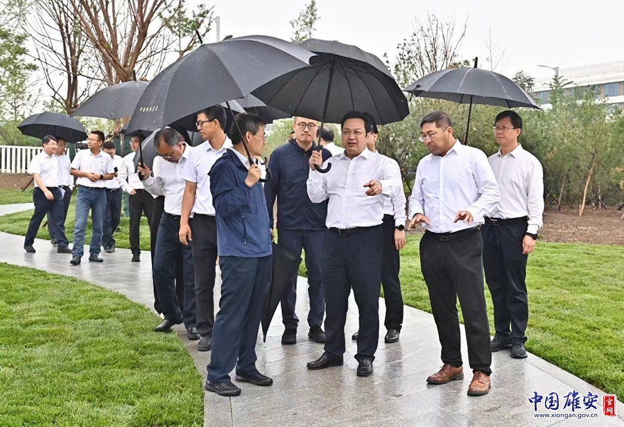 正值盛夏,雨丝绵绵。张国华一行首先冒雨来到中国星网雄安新区总部大楼,调研检查中国星网总部运营及周边配套设施建设情况。随后前往中国绿发、西北部社区服务中心、中交启园和中化金茂府项目现场,实地调研项目建设进展及防汛准备工作。之后前往中央绿谷EB3桥下空间、启动区13#水系东西轴段、南河枢纽和留通桥,详细听取项目进展和防汛排涝体系建设情况,对下一步工作进行安排部署。