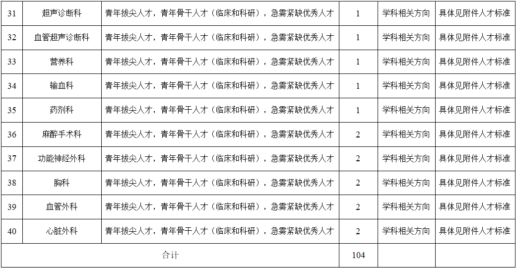 医院目前已开诊试运行。为切实加强我院人才队伍建设,满足正常开诊和学科发展需要,拟开展2024年度高层次人才引进工作,计划引进104人。现就医院本次招聘事宜公告如下:
