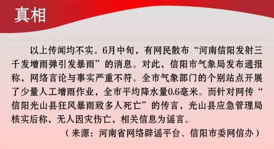 谣言07:河南信阳发射三千发增雨弹引发暴雨?信阳光山县狂风暴雨致多人死亡?