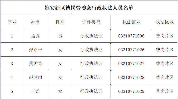 雄安新区昝岗管委会行政执法人员名单