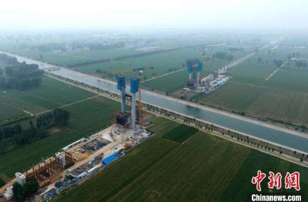 7月15日,雄忻高铁跨南水北调矮塔斜拉桥建设现场。(无人机照片)韩冰 摄