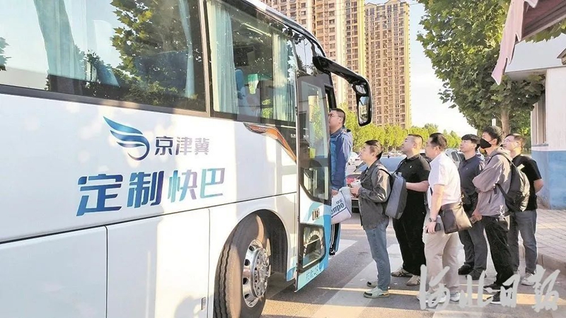 图为5月27日,涿州市香邑溪谷东站点,市民正在排队上定制快巴。当日,涿州至北京通勤定制快巴线路开通。(河北日报资料片)河北日报记者曹智 摄