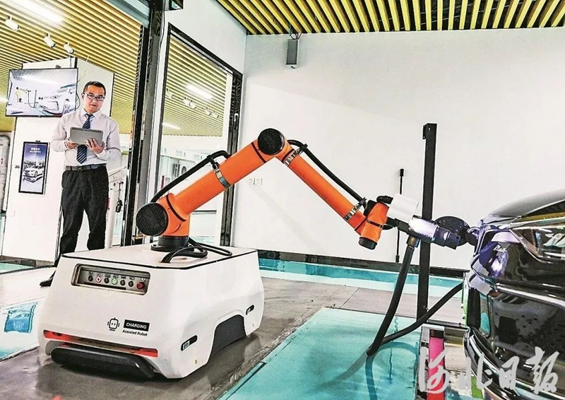 图为6月13日,雄安新区剧村变电站内,移动抓枪式充电机器人利用AI算法自动规划最佳的充电路径,为车辆自动充电。(河北日报资料片)河北日报记者耿辉 摄