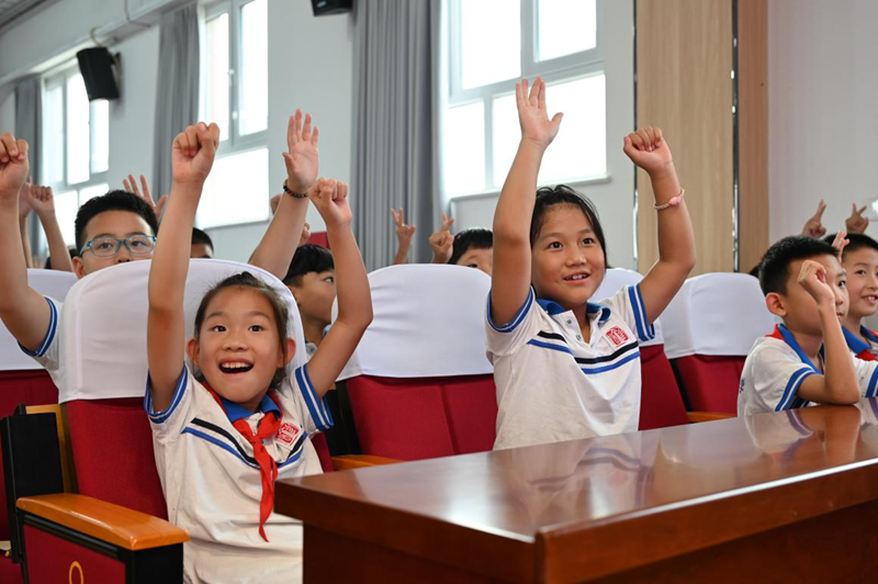 7月22日,中国科学院老科学家科普演讲团副团长、中国科普作家协会国防科普委员会副主任石磊(右一)走进雄安新区雄县第一小学,为孩子们带来一堂航空航天科普课。图为孩子们体验航天员训练项目。记者曹铮 摄
