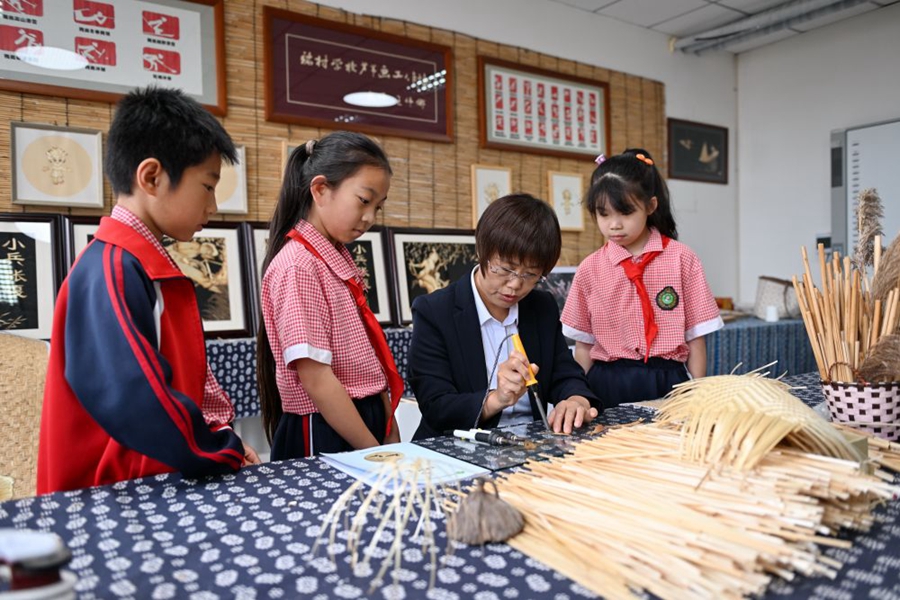 雄安新区教师教授学生芦苇画制作技巧。牟宇 摄