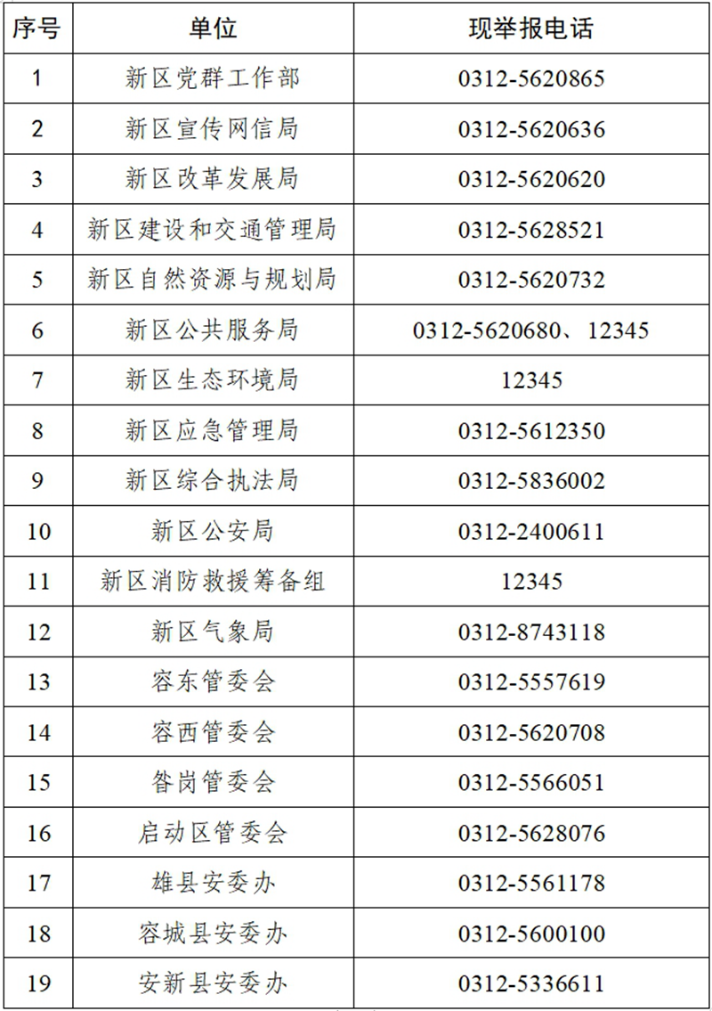 为认真贯彻落实《中华人民共和国安全生产法》《河北省安全生产条例》和《河北省安全生产举报和奖励办法(试行)》等法律法规和文件规定,鼓励企业内部员工和广大群众举报安全生产事故隐患和非法违法行为,进一步加强安全生产领域社会监督,及时治理和消除各类安全隐患,现将雄安新区各单位的安全生产举报电话公示如下: