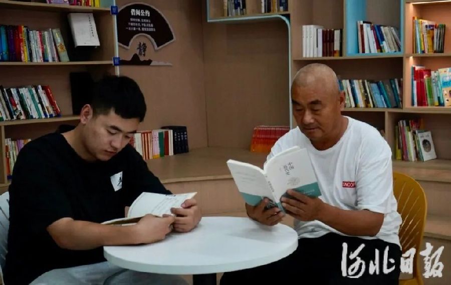 7月16日下午,雄安新区南文营社区居民刘炳辉(右)在社区党群服务中心图书角看书。河北日报通讯员王涵璞 摄