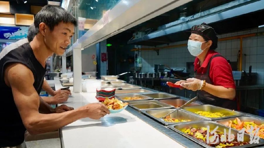 7月16日傍晚,雄安新区南文营社区食堂里,陆续有居民来打饭。河北日报通讯员王涵璞 摄