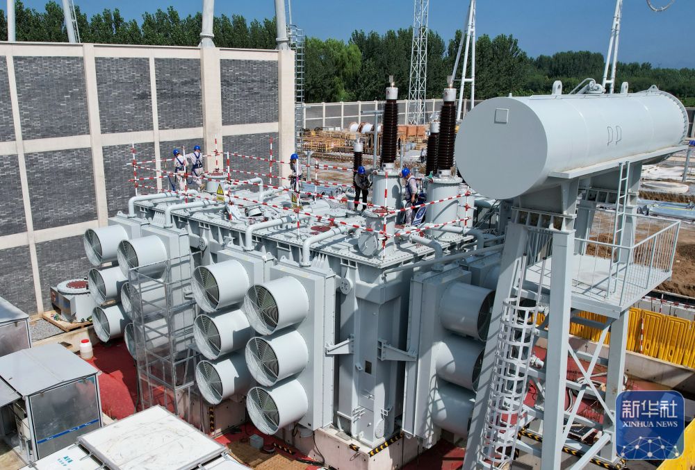 8月5日,工人在雄安(北京西)1000千伏特高压变电站扩容工程建设工地施工(无人机照片)。