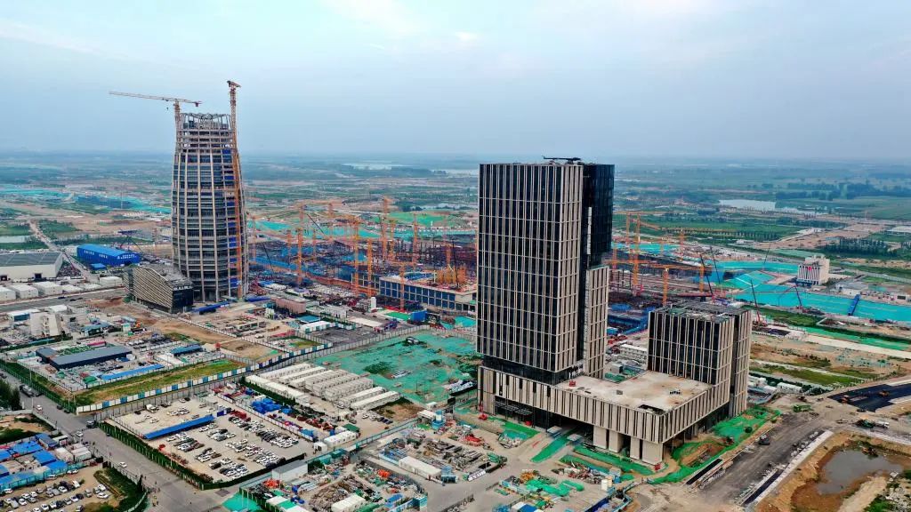 这是位于雄安新区启动区内的中国华能总部大楼(右)和中国中化总部大楼建设现场(8月8日摄,无人机照片)。新华社记者 王晓 摄
