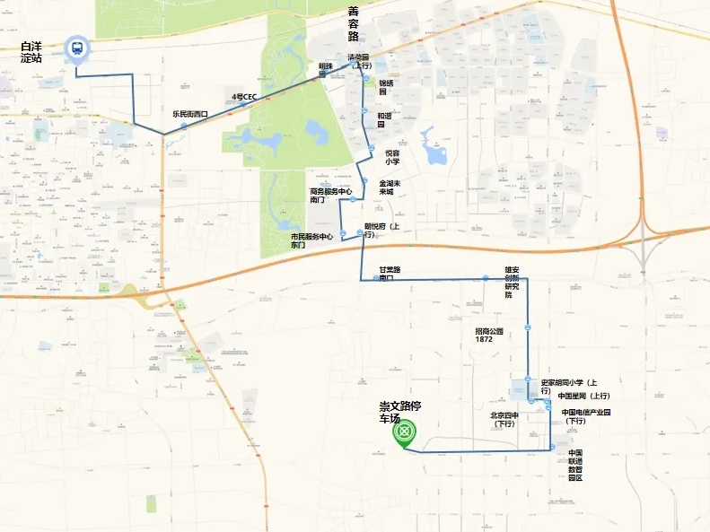 中途设站:中国联通数智园区、中国星网(上行站点)、中国电信产业园(下行站点)、北京四中(下行站点)、史家胡同小学(上行站点)、招商公园1872、雄安创新研究院、甘棠路南口、朗悦府(上行站点)、市民服务中心东门、商务服务中心南门、金湖未来城、悦容小学、和谐园、锦绣园、清荷园(上行站点)、明珠园、4号CEC、乐民街西口。