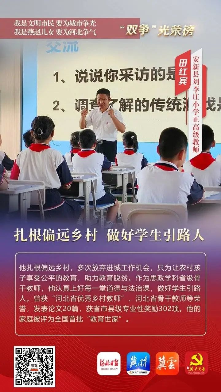 田红宾,男,1978年11月出生,中共党员,安新县刘李庄小学正高级教师。他扎根偏远乡村,多次放弃进城工作机会,只为让农村孩子享受公平的教育,助力教育脱贫。作为思政学科省级骨干教师,他认真上好每一堂道德与法治课,做好学生引路人。曾获“河北省优秀乡村教师”、河北省骨干教师等荣誉,发表论文20篇,获省市县级专业性奖励302项。他的家庭被评为全国首批“教育世家”。