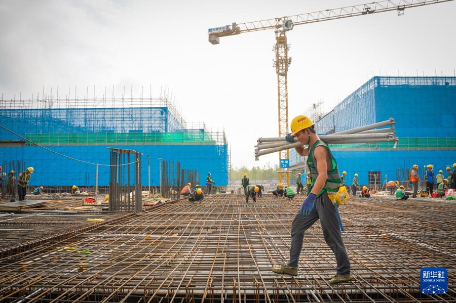 8月21日,中建三局工人在雄安科创中心二期、三期项目建设现场施工。新华社记者牟宇 摄