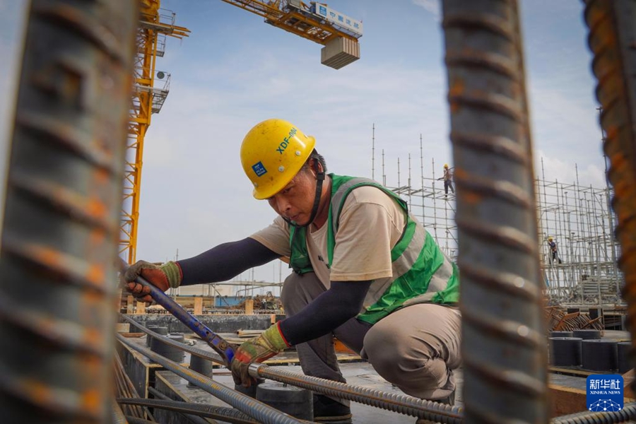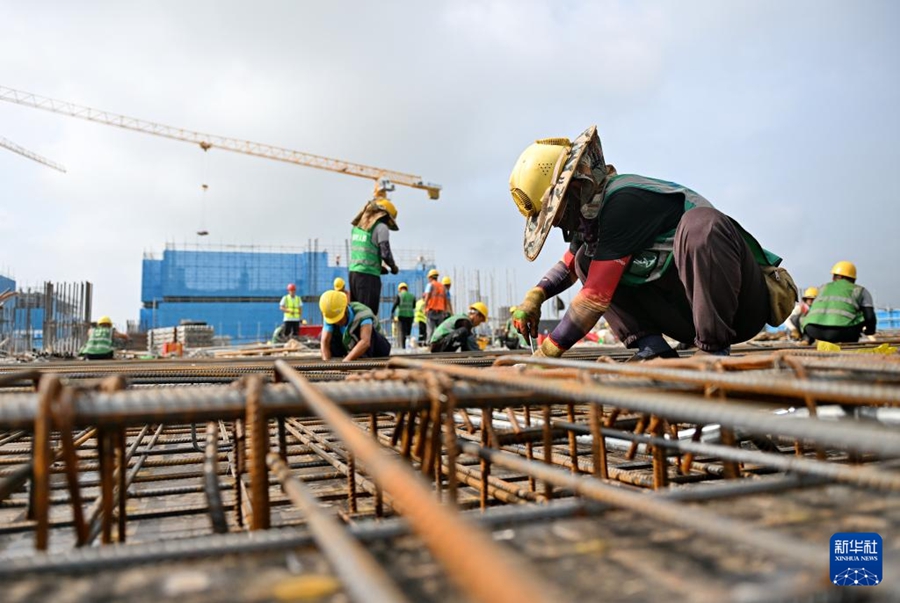 8月21日,中建三局工人在雄安科创中心二期、三期项目建设现场捆绑钢筋。新华社记者牟宇 摄