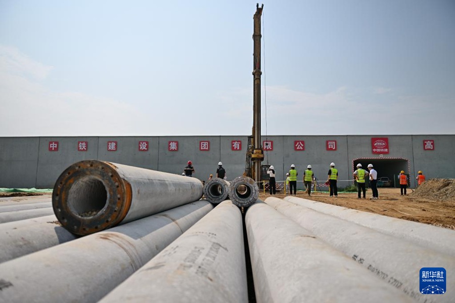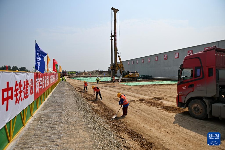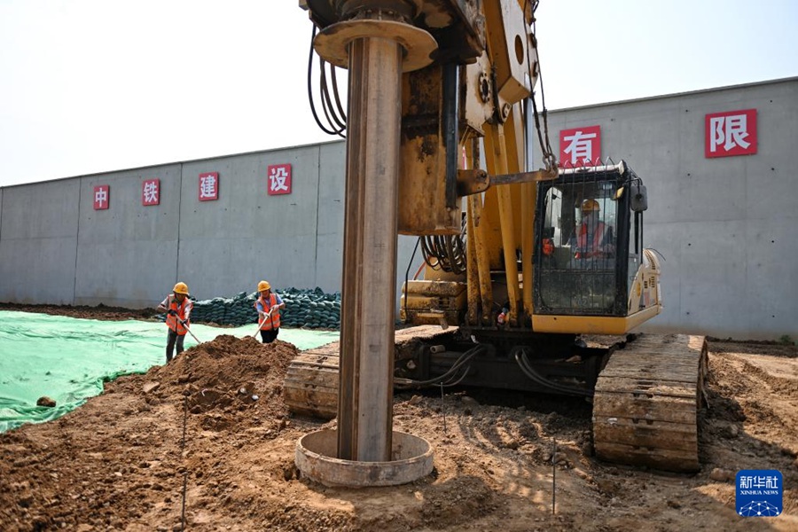 8月23日,中铁建设集团工人在雄忻高铁唐县站建设现场施工。新华社记者牟宇 摄