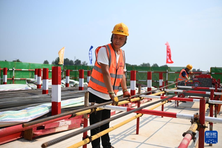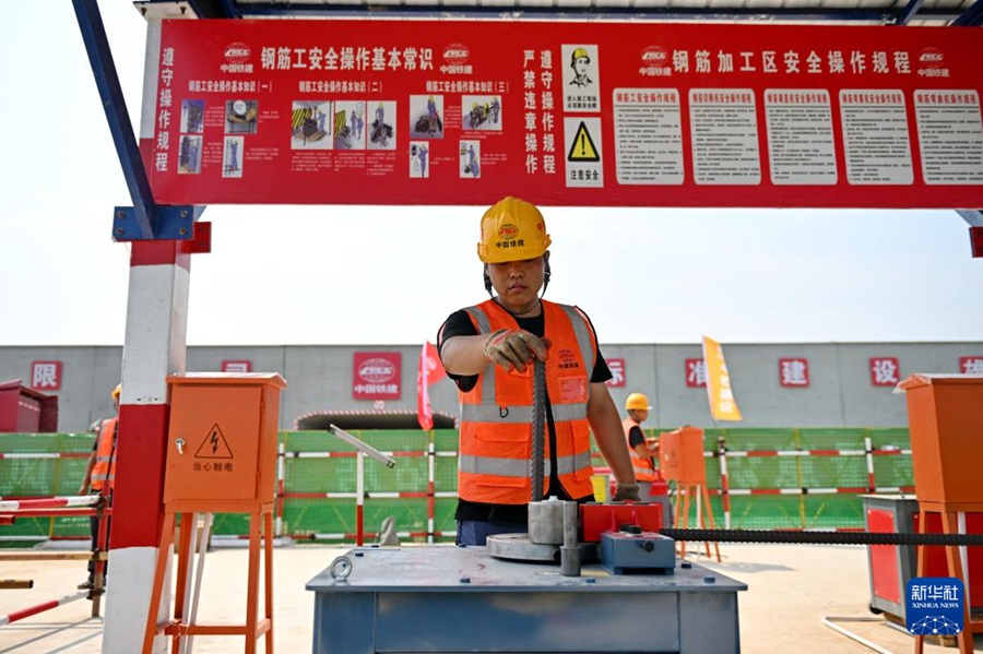 8月23日,中铁建设集团工人在雄忻高铁唐县站建设现场处理钢筋。新华社记者牟宇 摄
