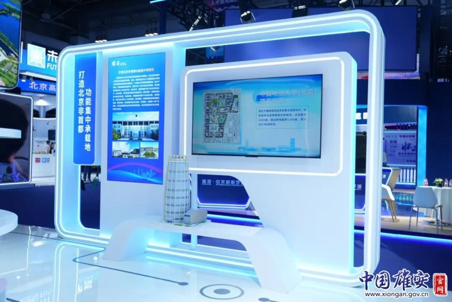 在打造北京非首都功能集中承载地部分,滚动播放4家央企总部建设实景图和规划图及中化大厦模型,展现央企疏解成效。高校雄安校区规划图和开工图、医院规划图滚动播放,凸显优质教育医疗资源集聚。