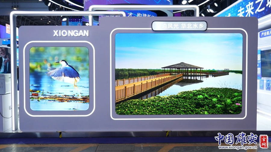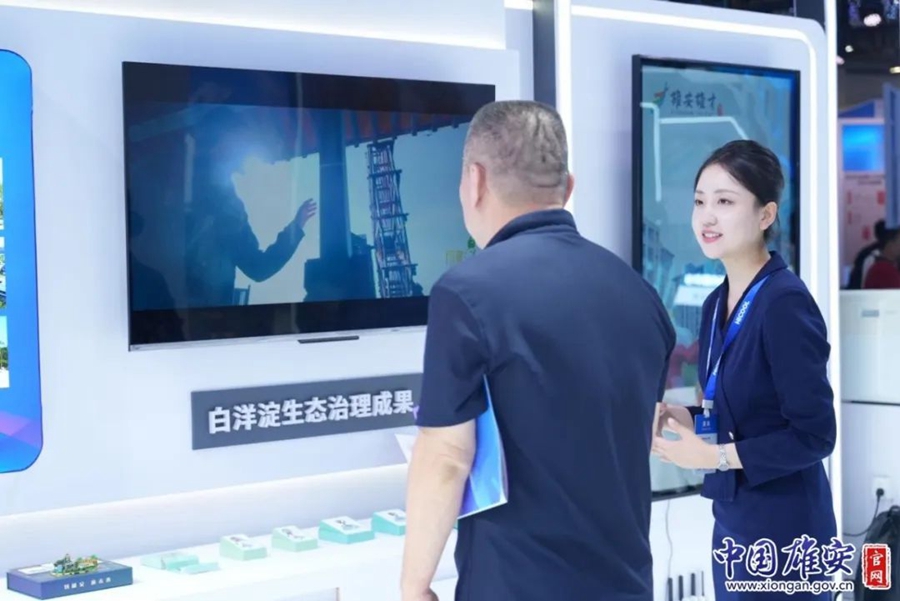 在打造清新明亮、水城共融生态之城部分,视频播放白洋淀生态治理成果,还有千年秀林、悦容公园等实景照片和互动AI拍照打卡,可以领略雄安新区生态之美。