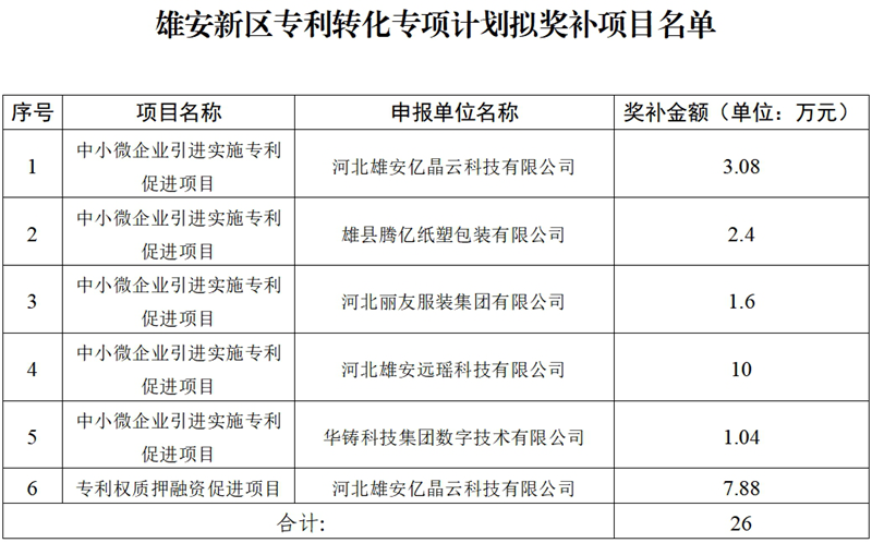 根据《雄安新区专利转化专项计划资金管理办法(试行)》(雄安执法发46号)、《雄安新区专利转化专项计划实施项目申报指南》等文件的有关要求,经项目征集、初审、专家评审等程序,河北雄安亿晶云科技有限公司等公司申报的6个专利转化专项计划实施项目已通过专家评审。现将上述项目名称、单位等向社会公示,若无异议后进行奖补;如有异议,请在公示之日起5个工作日(8月29日至9月4日)内提出书面意见,并注明真实姓名、工作单位和联系电话,否则不予受理。