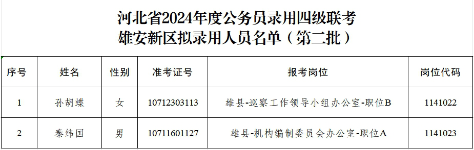 根据河北省2024年度公务员录用省市县乡四级联考工作统一安排,经报名和资格审查、体能测评、笔试、证件审核、面试、体检、考察等程序,雄安新区第二批拟录用孙胡蝶等2名同志(名单附后)为公务员,现予以公示。