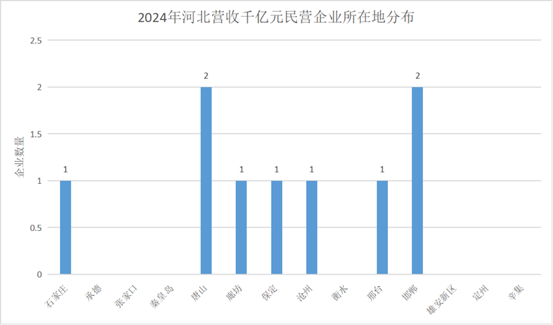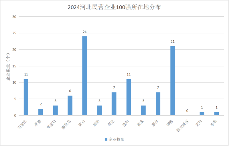 2024河北民营企业100强所在地分布。人民网 朱延生制图从地域来看,在最新的榜单中,唐山、邯郸分别有2个千亿元级民营企业。在所有入围企业中,唐山又以24个企业成为上榜企业最多的地区。