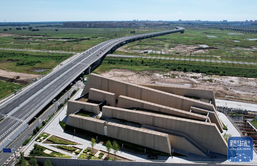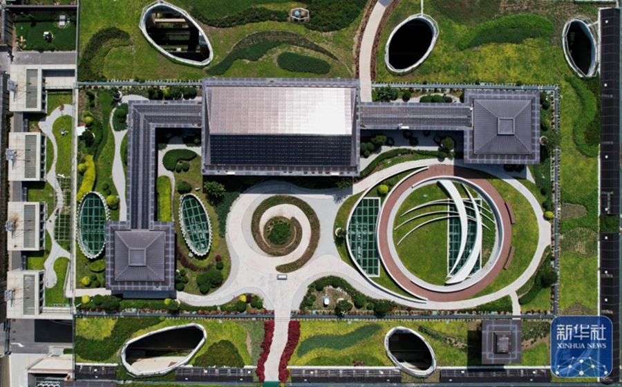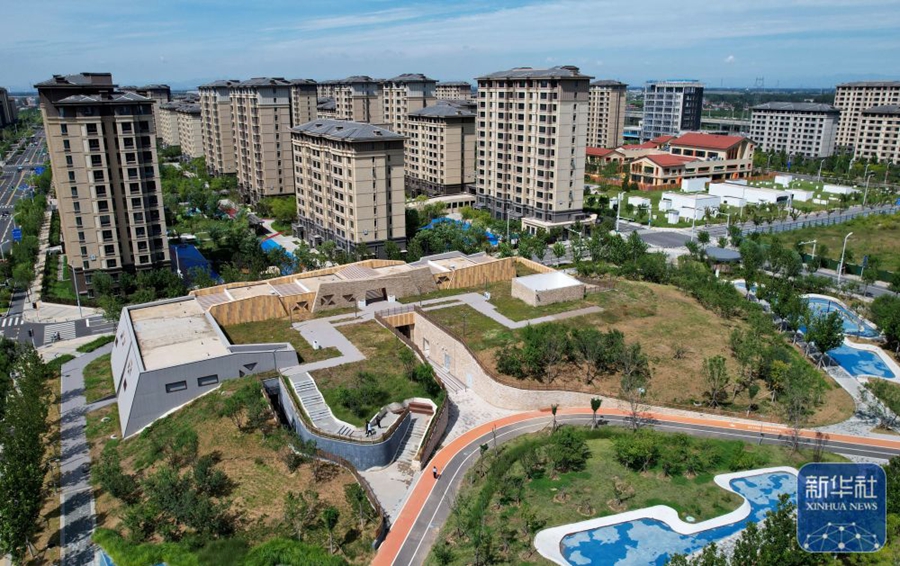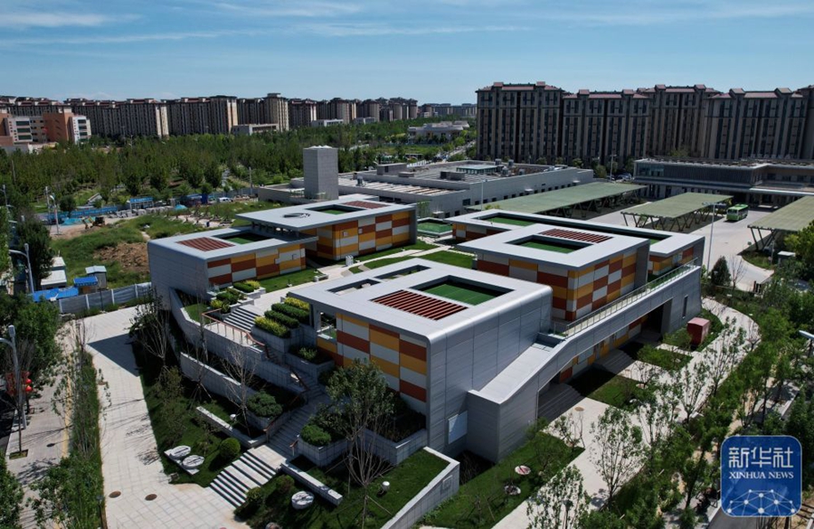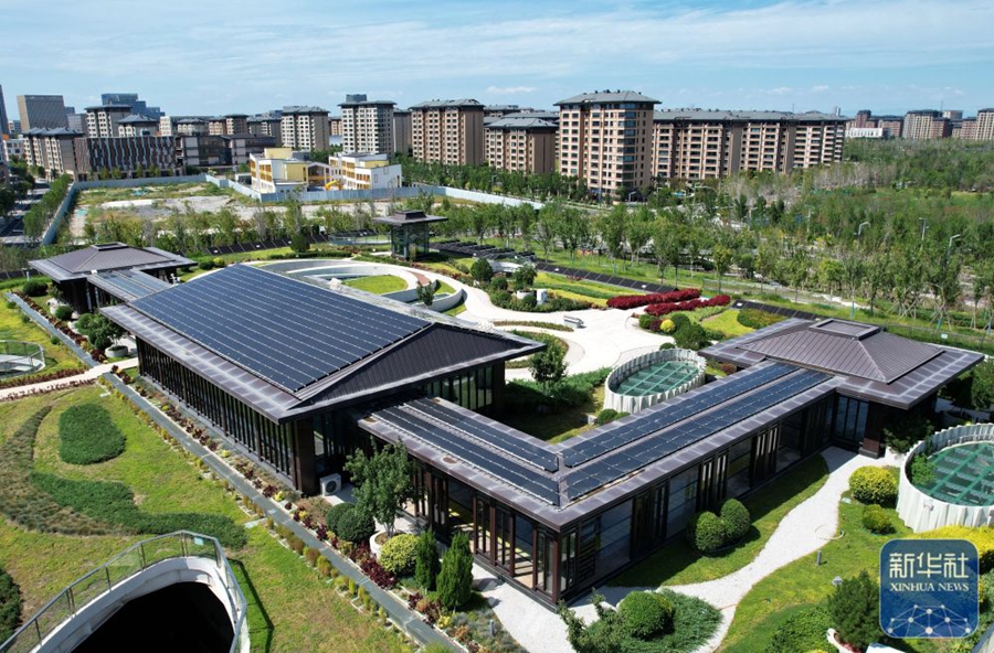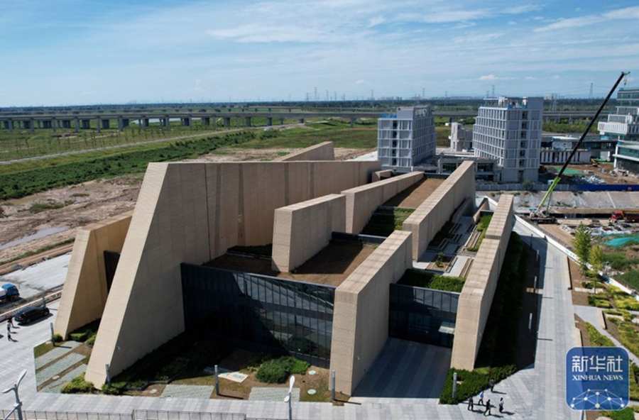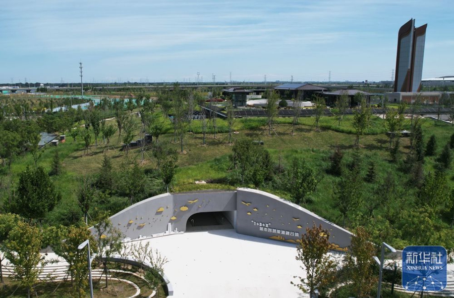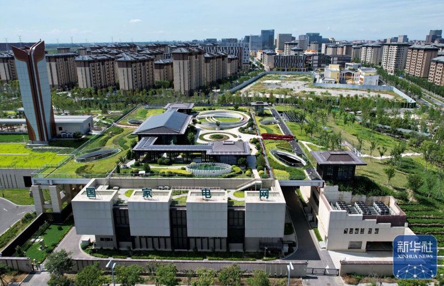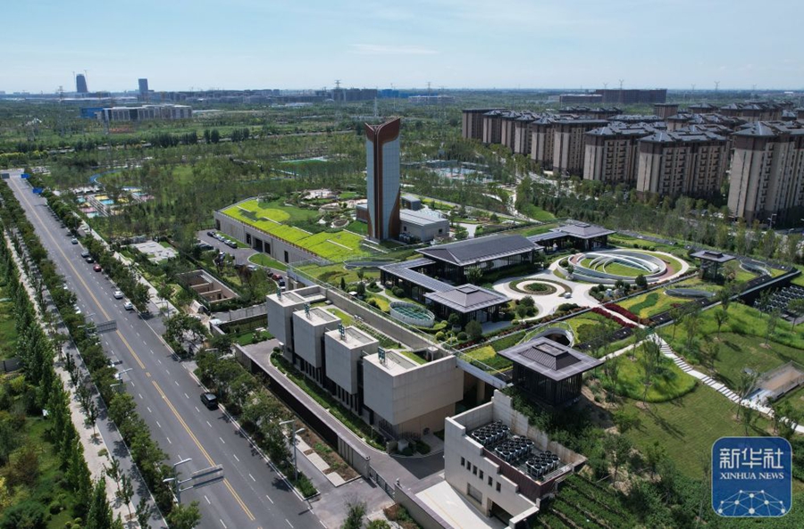 9月5日拍摄的河北雄安新区“智慧能源立方”——剧村220千伏变电站外景。该变电站屋顶覆土建设成公园,形成与城市融合共生的图景(无人机照片)。