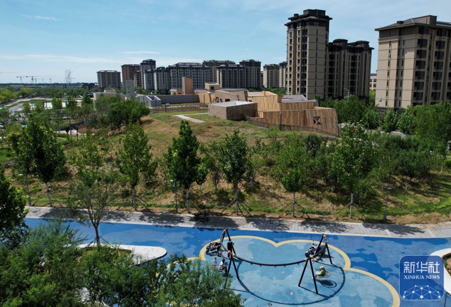 9月5日拍摄的河北雄安新区“桃源梦境”——段沙 110千伏变电站外景。该变电站设立于云溪公园地下,与城市融合共生(无人机照片)。