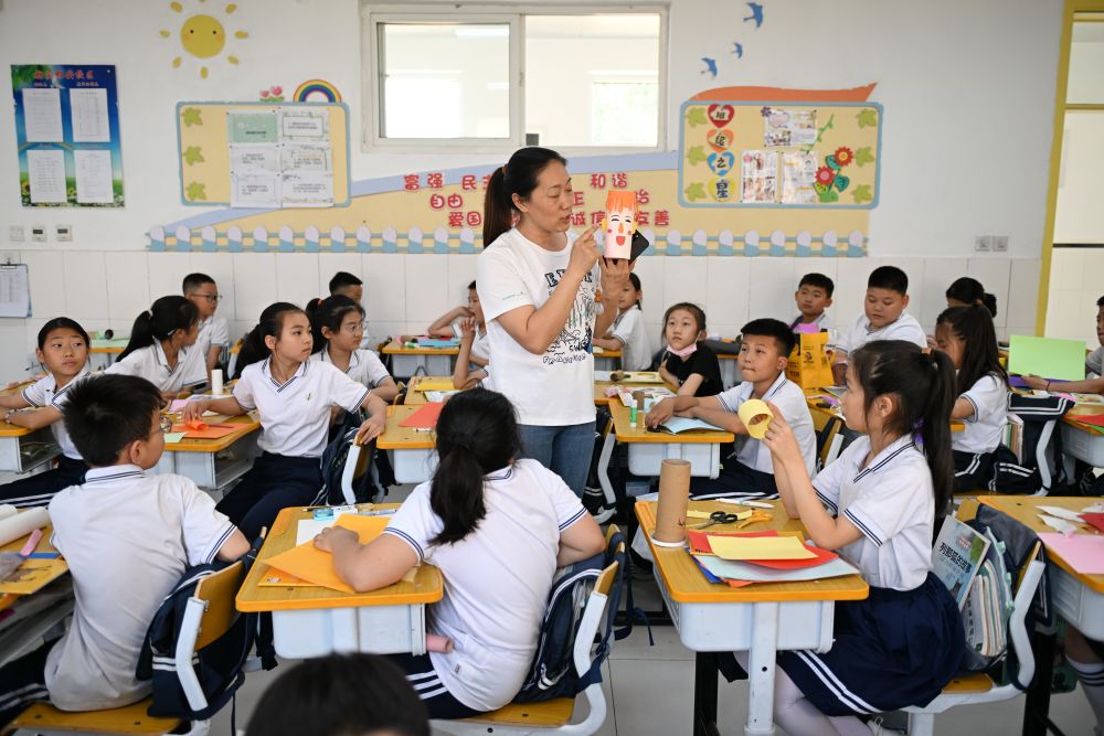 北京市朝阳区实验小学雄安校区的老师给学生上手工课。新华社记者牟宇 摄