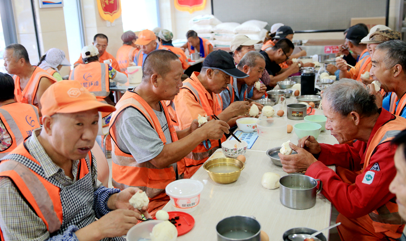 8月28日,环卫工人们正在志愿沧州爱心服务站吃爱心早餐。新华网吕翔 摄