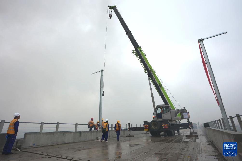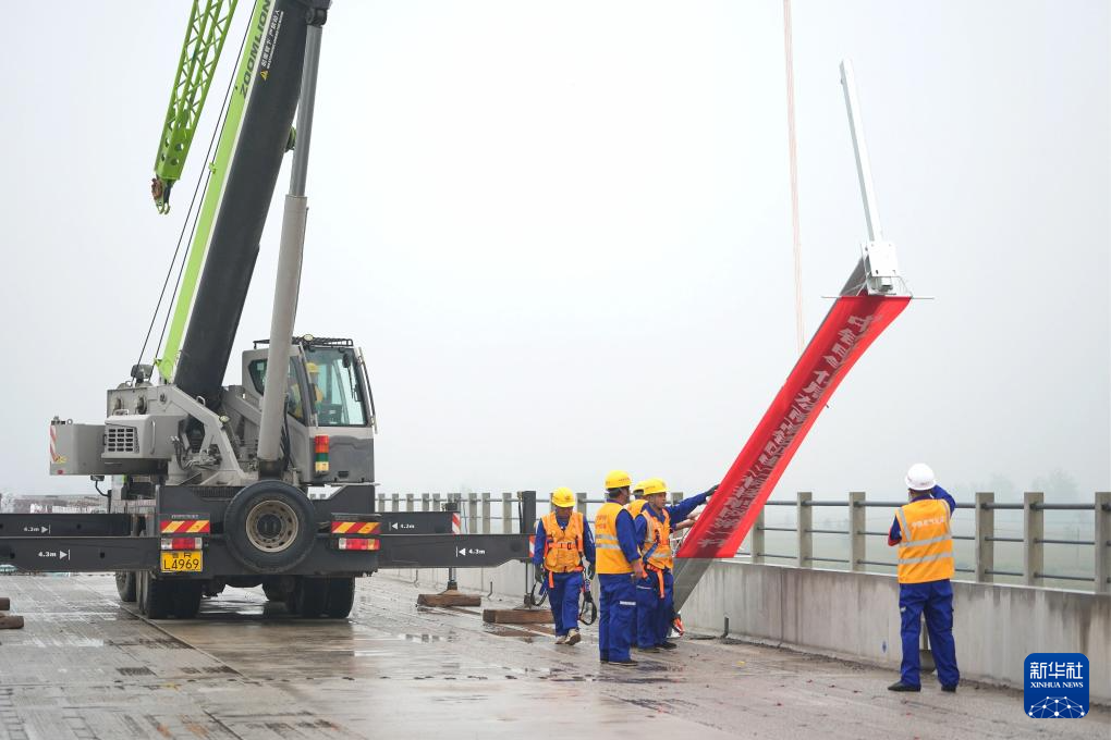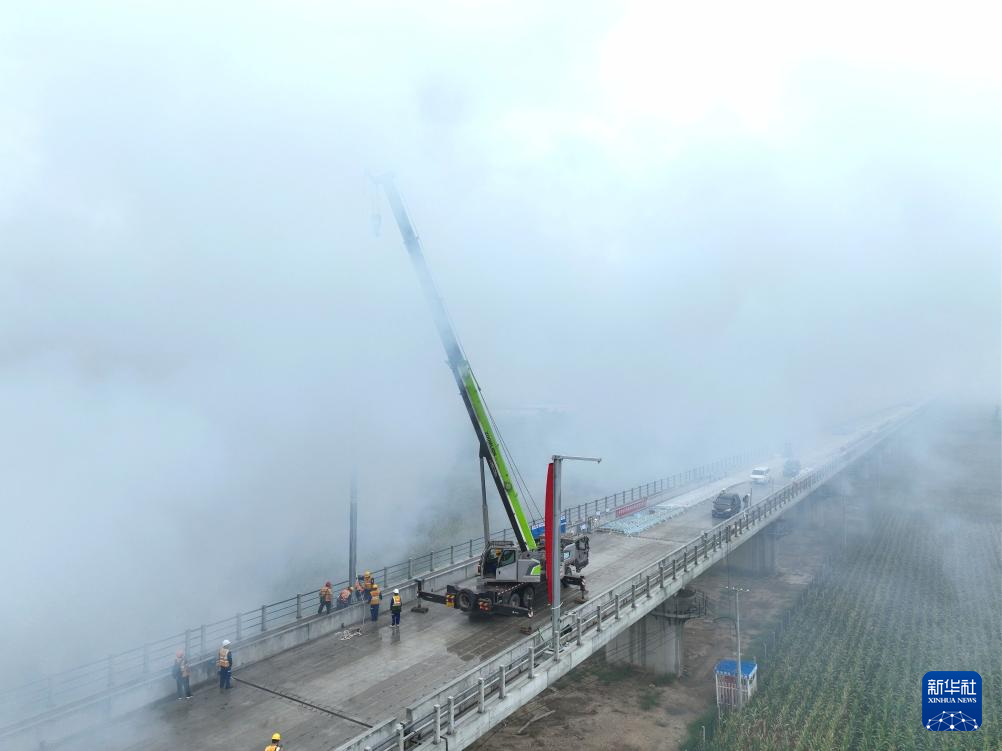 9月13日,中铁电气化局的工人在雄商高铁山东菏泽段吊装接触网支柱。新华社记者邢广利 摄